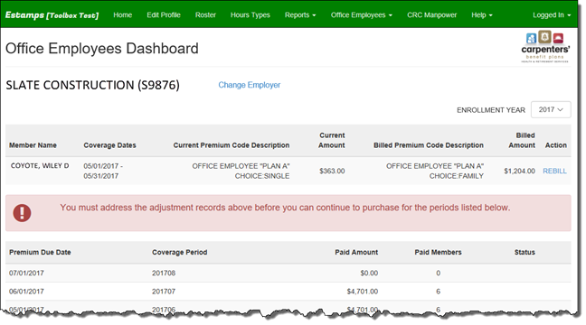 Note: If the Employer has pending billing adjustments they will see the message: “You must address the adjustment records above before you can continue to purchase for the periods listed below”.